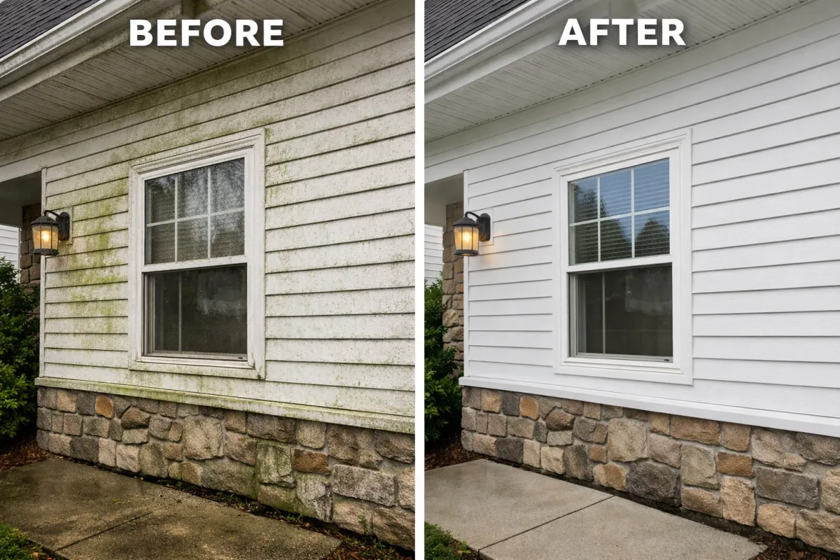 Routine house washing helps remove this organic buildup and keeps siding, trim, and exterior surfaces looking clean throughout the year.
